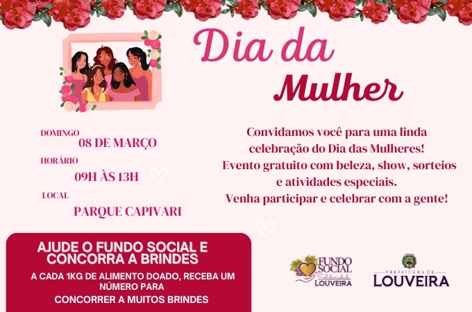 A Prefeitura de Louveira, por meio do Fundo Social de Solidariedade promove neste domingo (8) uma programação especial em comemoração ao Dia Internacional da Mulher, no Parque Capivari. O evento será realizado das 9h às 13h, com diversas atividades gratuitas voltadas ao bem-estar, saúde, beleza e lazer, além de atrações para toda a família.