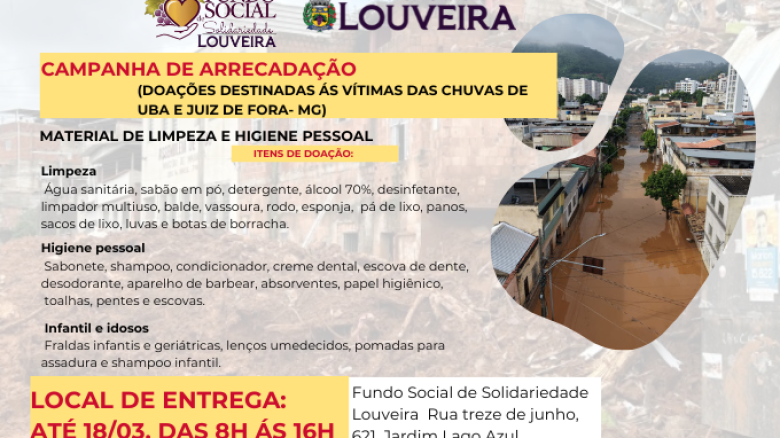Fundo Social de Louveira inicia campanha de arrecadação para vítimas das chuvas em Minas Gerais
