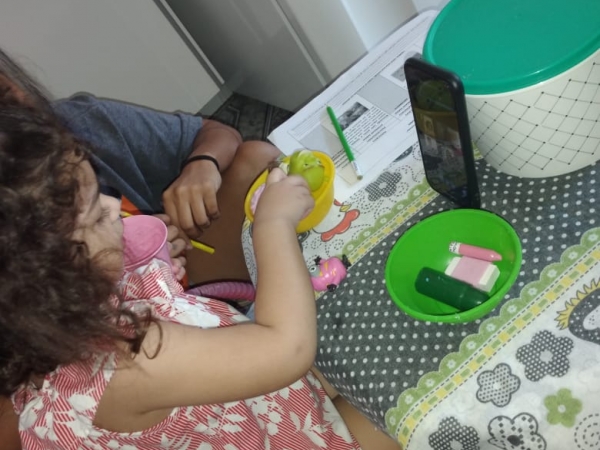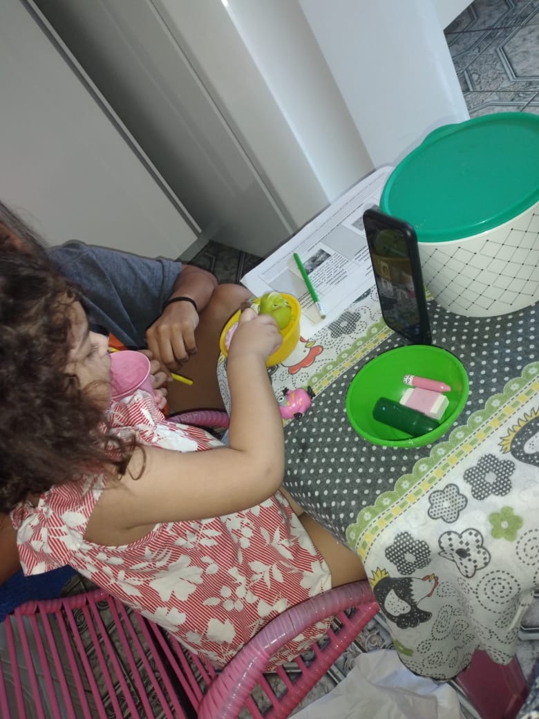 A pequena Lorena Ferreira Consolin Silva, que cursa a Fase 2 no Ceci Pica-Pau Amarelo, participou da aula online acompanhada pela avó, Michelle Ferreira. “Ela amou tudo. Foi maravilhoso poder fazer as atividades com acompanhamento da professora. A Prefeitura está de parabéns. A plataforma é ótima, não travou nenhuma vez”, celebra Michelle.