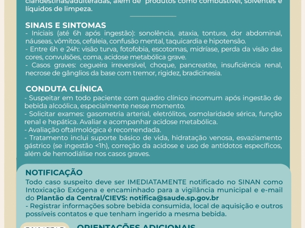 A orientação é que toda pessoa que ingerir bebidas alcoólicas e apresentar os seguintes sintomas entre 6 e 24 horas procure um serviço de saúde imediatamente.