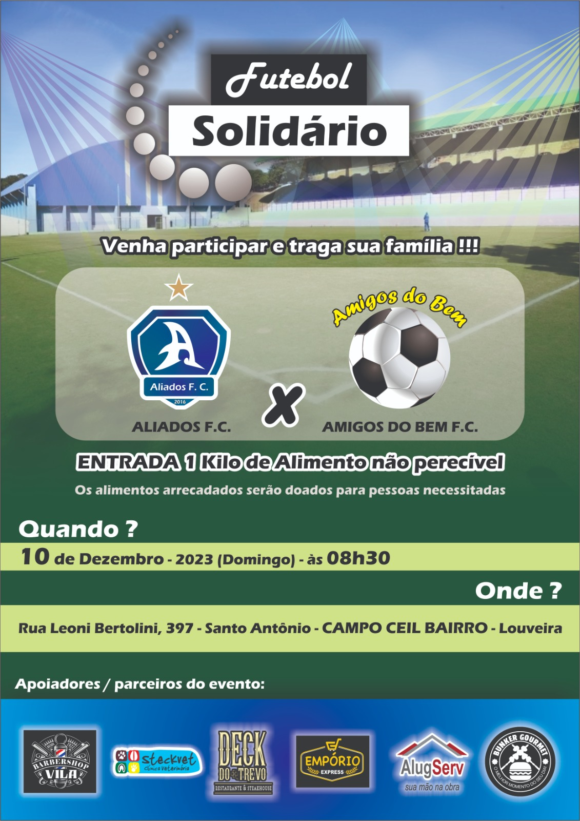 O Campo do Ceil Bairro recebe, neste domingo, uma partida de Futebol Solidário entre os times Aliados F.C e Amigos do Bem F.C, com início às 08h30. A entrada será um quilo de alimento não perecível. O objetivo do jogo é arrecadar alimentos para doar às pessoas necessitadas.