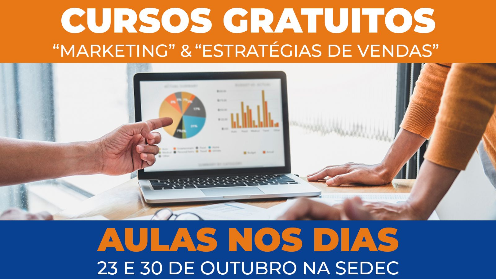 São dois cursos Marketing e Estratégias de Vendas, cujas aulas são presenciais e acontecem na sede da Sedec, nos dias 23 e 30 de outubro, às 19h. As inscrições estão abertas e devem ser feitas pelo link https://forms.gle/WKhFeNpWKK3rSjDdA