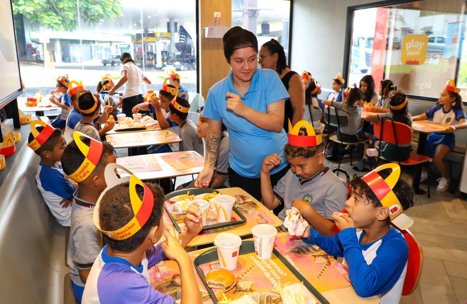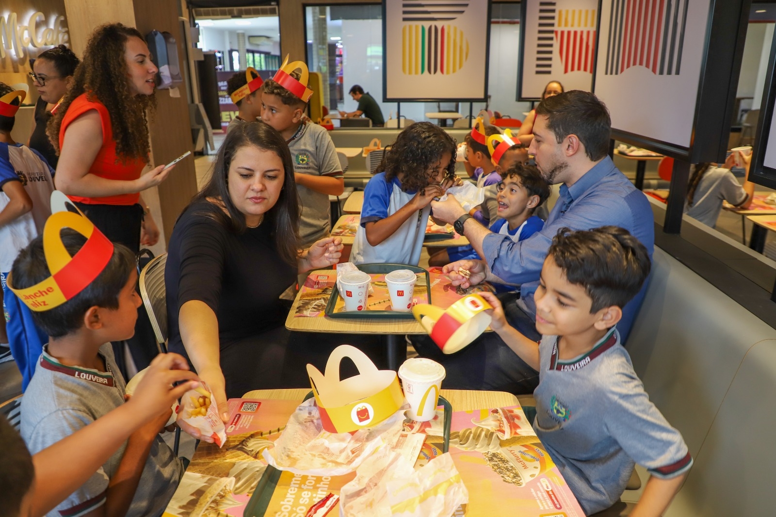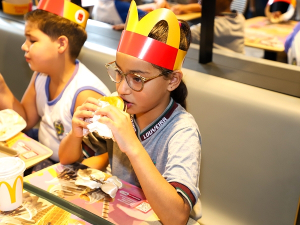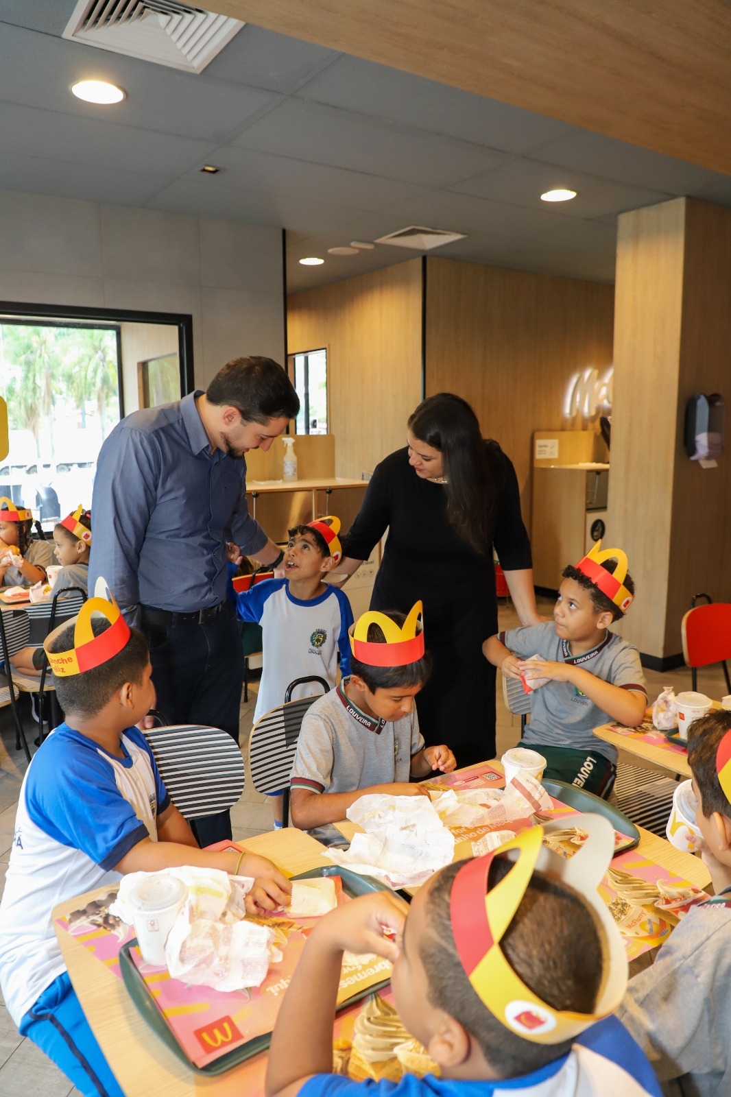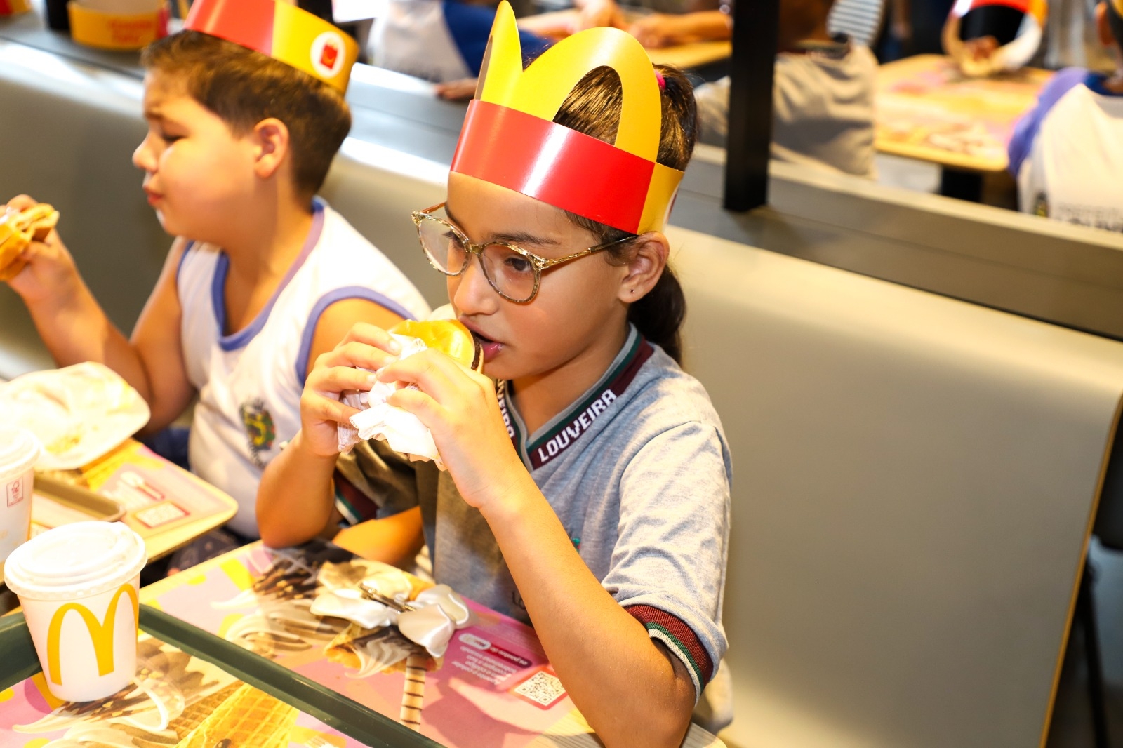 Na sequência, os estudantes foram recepcionados na unidade de Louveira do McDonald's, onde participaram de um lanche oferecido pelo restaurante, sem custos para o município. Para muitos alunos, esse foi um momento ainda mais especial: alguns viveram a experiência de estar no McDonald’s pela primeira vez, tornando a atividade não apenas educativa, mas também marcante do ponto de vista social e emocional. O momento proporcionou integração, convivência e a vivência de uma experiência diferenciada, ampliando o repertório cultural e social das crianças.