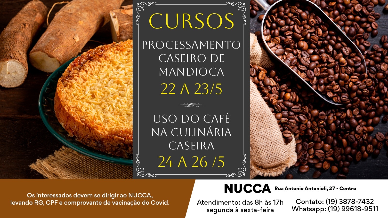 Os cursos ‘Processamento Caseiro de Mandioca’ (22 a 23 de maio) e ‘Uso do Café na Culinária Caseira’ (24 a 26 de maio) acontecem na cozinha experimental do projeto CozinhaAlimento; somados os dois cursos, são 40 vagas ofertadas