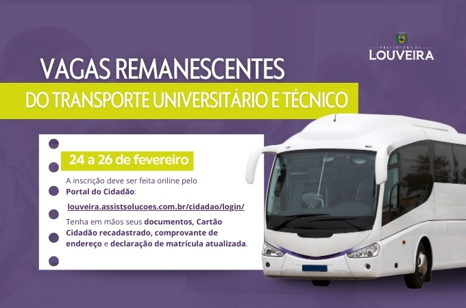 A Prefeitura de Louveira, por meio da Secretaria de Educação, abre vagas remanescentes para o transporte gratuito destinado a estudantes de cursos universitários e técnicos.