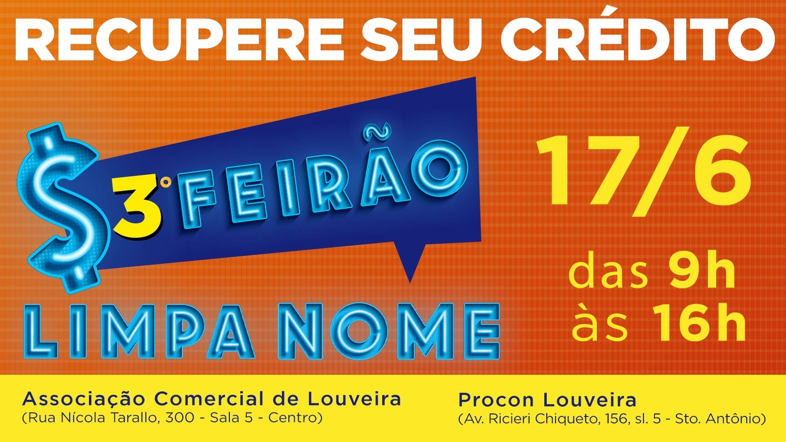 Em uma importante ação com objetivo de contribuir para a renegociação de dívidas por parte da população de Louveira, a Prefeitura apoia o 3º Feirão Limpa Nome, realizado pelo Procon (Fundação de Proteção e Defesa do Consumidor). O Feirão acontece no próximo sábado, 17 de junho, das 9h às 16h, em dois locais simultaneamente: na Associação Comercial de Louveira e no Procon Santo Antônio.