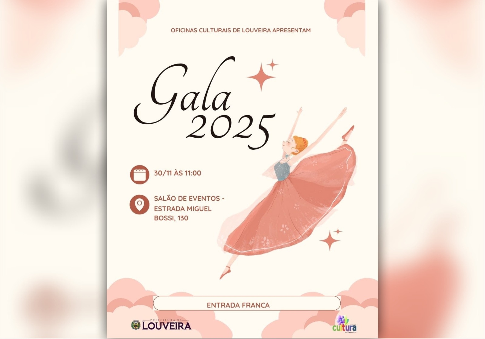 A Prefeitura de Louveira, por meio da Secretaria Municipal de Cultura & Eventos, convida toda a população para o evento especial "Gala 2025", que ocorrerá no dia 30 de novembro, às 11h, no Salão de Eventos da Cultura, localizado na Estrada Miguel Bossi, 130. O evento é gratuito e aberto ao público, prometendo uma manhã repleta de beleza, técnica e emoção.
