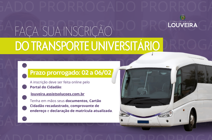 A Prefeitura de Louveira, por meio da Secretaria de Educação, informa que as inscrições para o transporte gratuito destinado a estudantes de cursos universitários e técnicos foram prorrogadas até o dia 06/02 (sexta-feira). O benefício é voltado para o primeiro semestre letivo de 2026. Todo o processo de cadastro deve ser realizado de forma online através do Portal do Cidadão. Para garantir a vaga, o estudante deve estar atento aos prazos, à documentação exigida e à necessidade de atualização cadastral.