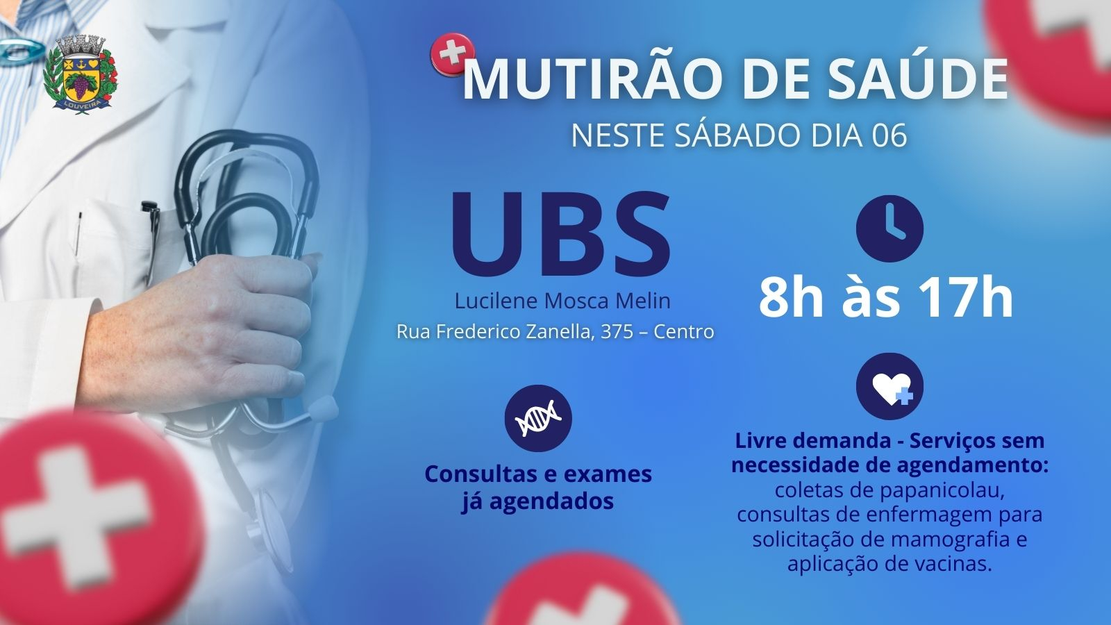 Em continuidade aos investimentos para atendimentos das demandas de consultas e exames na área da Saúde, a Prefeitura de Louveira, por meio da Secretaria de Saúde, realiza mais um mutirão de Saúde neste sábado (6) na Unidade Básica de Saúde do Centro (UBS Lucilene Mosca Melin). A unidade estará aberta das 8h às 17h para coletas de papanicolau, consultas de enfermagem para solicitação de mamografia e aplicação de vacinas em livre demanda. Além disso, será realizado uma série de procedimentos agendados.