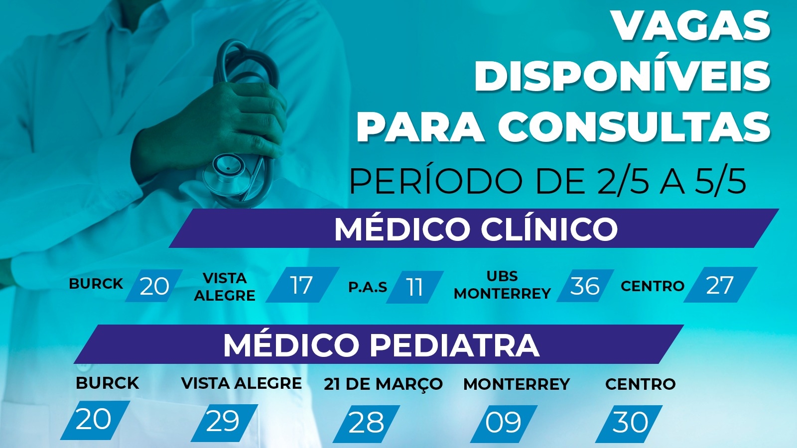 Do total de vagas disponíveis, 116 são para consultas pediátricas e 111 são consultas clínicas