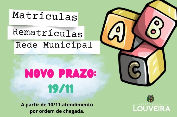 A Secretaria Municipal de Educação de Louveira comunica à comunidade escolar que o prazo para rematrícula dos alunos da rede municipal foi prorrogado até o dia 19 de novembro. As rematrículas, que originalmente se encerrariam nesta sexta-feira, 7 de novembro, serão prorrogadas com atendimentos junto ao calendário das novas matrículas.